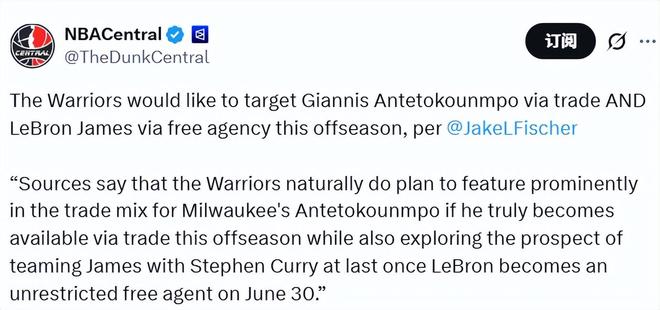 曝勇士今夏将追两大巨星!全力交易字母哥 寻求签詹姆斯联手库里