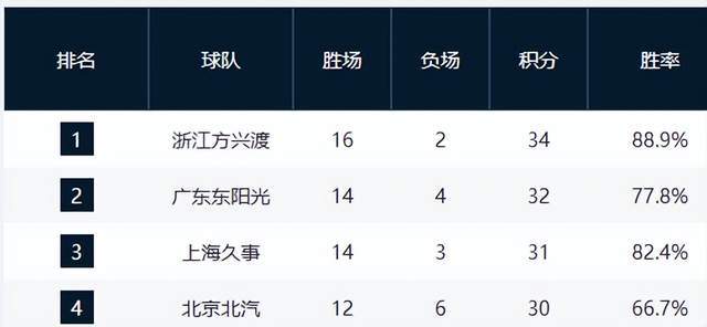广厦作为卫冕冠军,实力强劲,目前以16胜2负的战绩领跑积分榜,胜率达到惊人的88.9%,是CBA20支球队中唯一一支胜率超过85%的球队。广东队以14胜4负的战绩紧随其后,上海队则因少赛一轮,以14胜3负的战绩暂居第三。