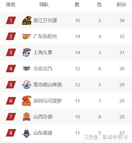 CBA积分榜最新排名出炉!北京杀回前4:广厦稳居第1山西第7