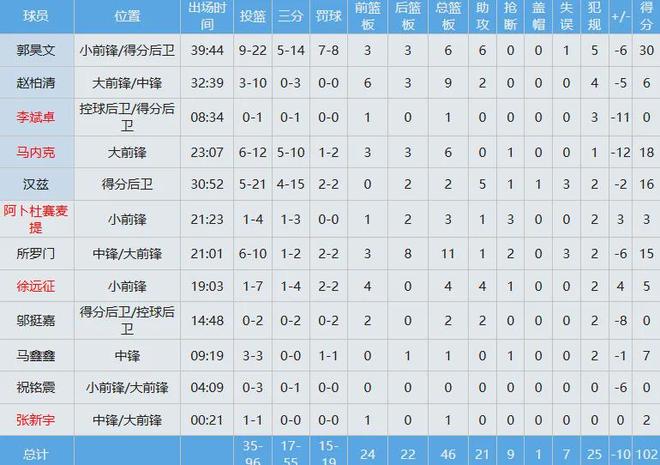 同曦队那边,只有郭昊文一名本土球员得分上双,出战约40分钟,投篮22中9(三分14中5),罚球8中7空砍30分6板6助全面数据,林葳离队征战NCAA之后他成为了球队新门面。