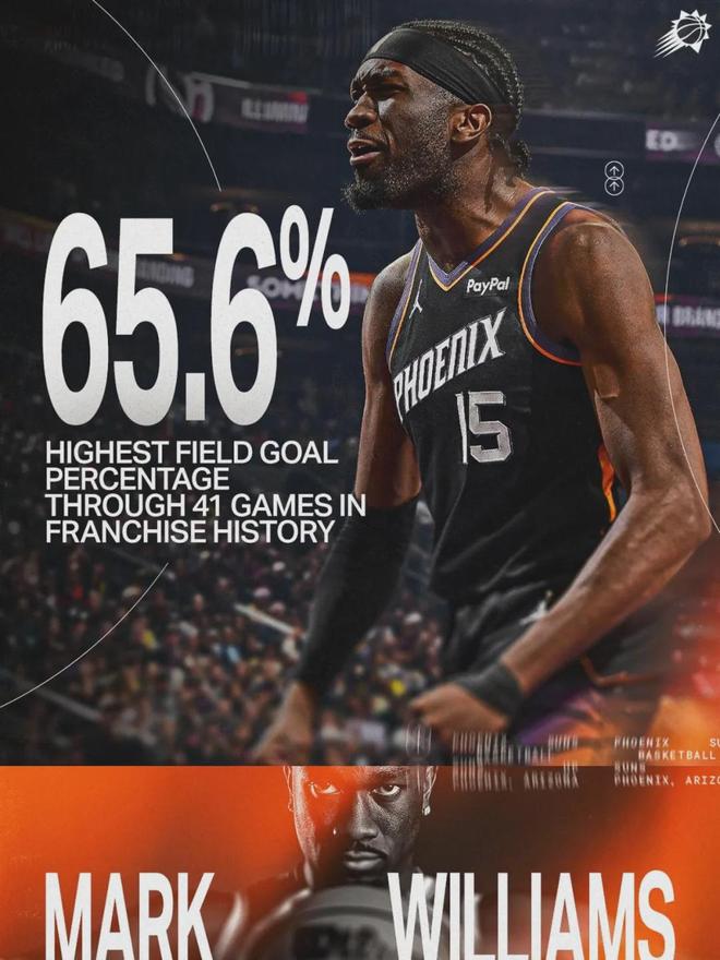 今天聊聊太阳中锋马克-威廉姆斯,昔日的玻璃中锋,本赛季也恢复健康了。加盟太阳之前,马威出勤率最高的一个赛季只打了44场常规赛。本赛季至今,马威已经打了39场常规赛,只缺席了5场,他肯定能打破生涯出勤率纪录。