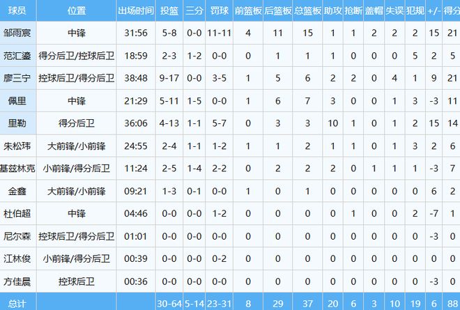 北控队那边,几名核心成员同时发威,特别邹雨宸打爆了没有周琦的北京队内线,21分15板大号两双到手,带领球队88-82拿下同城德比。