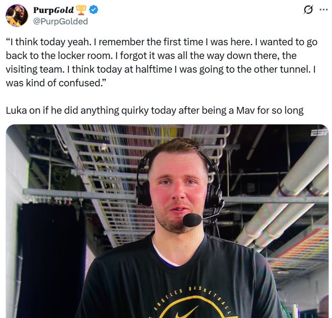在比赛中场结束时,独行侠队记Noah Weber曝出东契奇直接朝着独行侠的球员通道走去,突然意识到不对后,又转身朝着位于球场的另一侧的湖人球员通道走去。