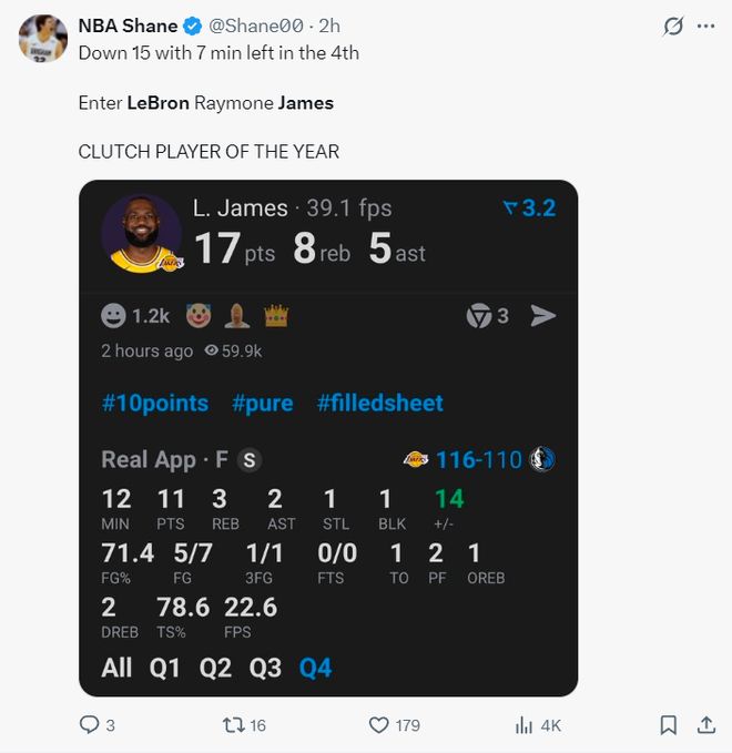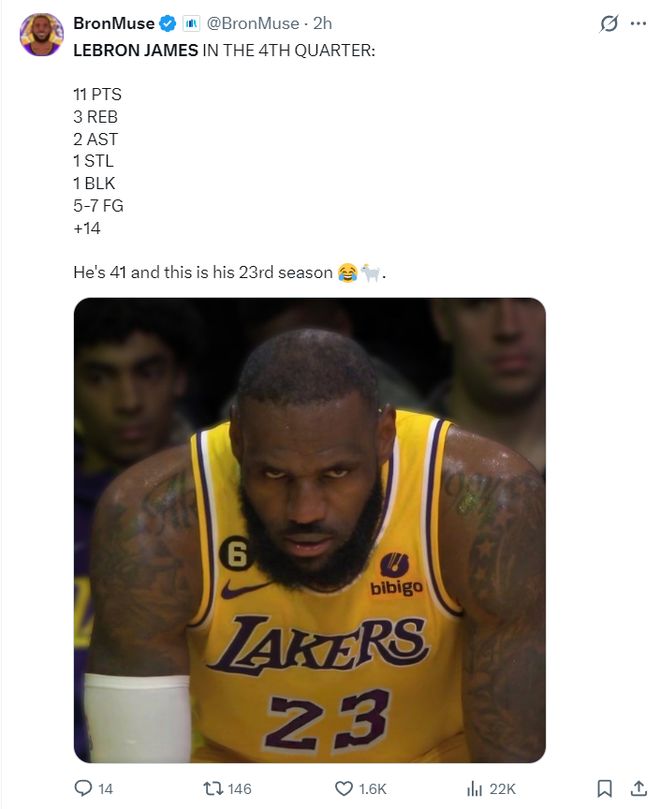 末节勒布朗打满了12分钟,7中5,三分1中1,在没有罚球的情况下拿到11分3篮板2助攻1抢断1盖帽,正负值+14,这里面还有一个切球没有算在数据内,湖媒盛赞41岁征战第23个赛季的老头子为GOAT。