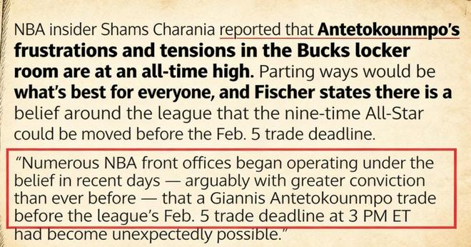 “雄鹿内部和更衣室的紧张氛围已经达到顶点,联盟很多球队的管理层都相信,或者说比任何时候都相信,在东部时间2月5日下午3点联盟交易截止日期之前,交易可能会达成。”Shams如是说道。