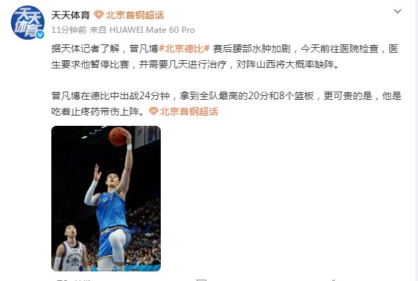 只是赛后曾凡博再度出现伤病反复情况,如今根据《天天体育》最新报道显示:“据天体记者了解,曾凡博在北京德比赛后腰部水肿加剧,今天前往医院检查,医生要求他暂停比赛,并需要几天进行治疗,对阵山西男篮将大概率缺阵。”