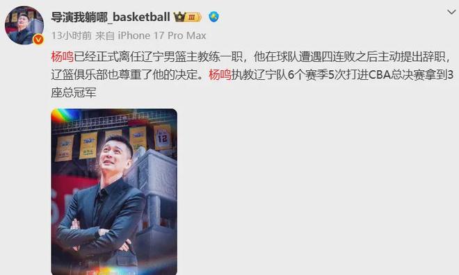 辽宁官宣杨鸣离职,29号将解说NBA!乌戈成为代理主帅!