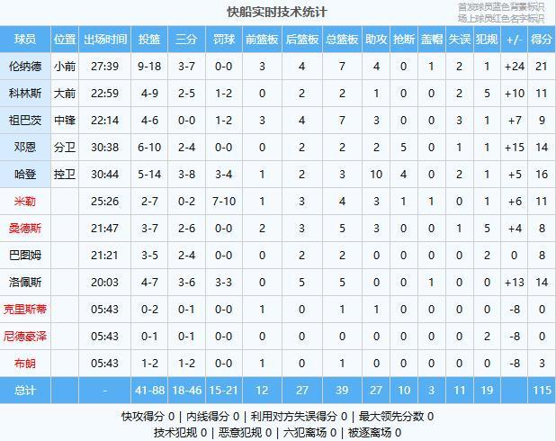 快船:伦纳德21分7板4助、哈登16分3板10助4断、洛佩斯14分5板、邓恩14分2板2助5断、米勒11分4板3助、科林斯11分2板1助、祖巴茨9分7板3助、桑德斯8分5板3助