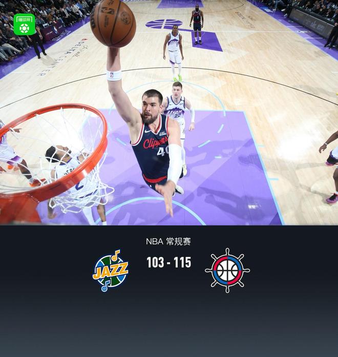 第四节爵士森萨博拿下11分,快船乔丹-米勒拿下9分,最终爵士103-115不敌快船