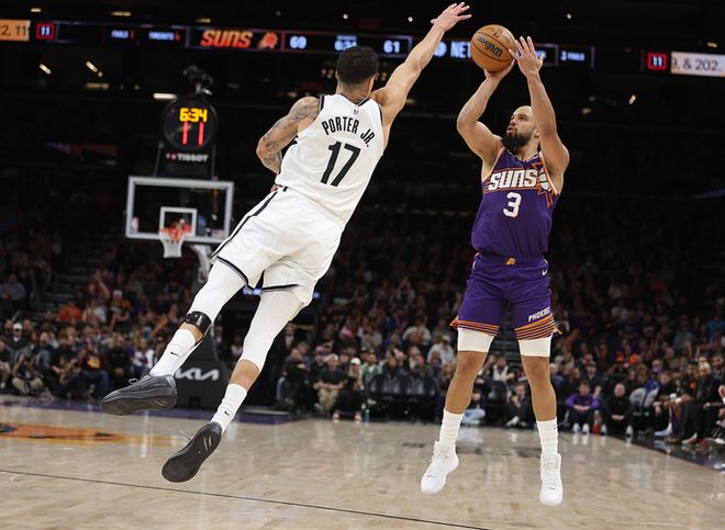 太阳主场迎战篮网,太阳少了布克、杰伦格林、吉莱斯皮,篮网少了克洛尼,上半场比赛太阳取得9分领先,下半场篮网追回5分,最终太阳106-102击败篮网。马威16中13得到27分6板1帽,狄龙15中9得到26分3板3助,篮网方面波特24中15(三分10中6)得到36分5板3助3断,杰明9中5得到15分5板3助。
