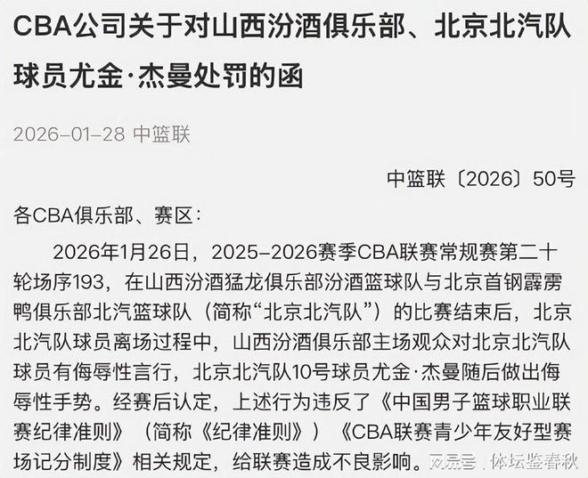 很快中篮联开始介入调查,最终认定山西主队球迷存在明显侮辱性言行,违反联赛相关规定。同时,中篮联的公告也指出,在遭遇侮辱之后,杰曼作出了不恰当的手势回应,这个动作同样被认定为违规,对联赛形象造成了负面影响。到了这里,其实很多人已经预料到会是“双罚”的结局,但中篮联的处罚决定还是引发了不小争议。