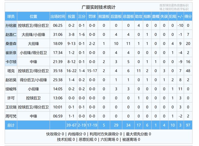 本场比赛,广厦队夺了97分,三个外援拿到了84分,其他球员一共拿了13分,其中,一个人拿了7分,其他三个人各拿了2分。
