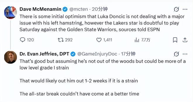 在McMenamin的最新报道出来后,Jeffries跟进表示,这样的结果算是不错了,但他的情况还不能完全掉以轻心,大概率只是一级轻度拉伤。如果确诊是拉伤的话,他很可能会缺阵1-2周。全明星周末来得真是太是时候了。显然,Jeffries认为全明星周末会是很好的养伤时间。