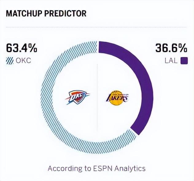 反观湖人,同样面临核心球员的伤病情况,东契奇何时回归,依旧没有具体的时间表。湖人在上一场比赛击败勇士,拿下三连胜,目前以32胜19负排在西部第五。湖人凭借近期的回暖稳住了西部前六的位置,也缩小了与前面球队的差距。上一场比赛,詹姆斯砍下20分7篮板10助攻的准三双数据带队取胜,尽管出现7次失误,但整体表现瑕不掩瑜。此前替补席乏力的湖人,在肯纳德的加盟后,替补火力也得以提升,此役湖人有三名替补球员得分上双,成为湖人赢球的一大亮点。本场比赛,东契奇、亚历山大继续缺阵,杰伦威廉姆斯复出。赛前,美媒ESPN预测本场比赛,雷霆胜率63.4%,湖人胜率36.6%。