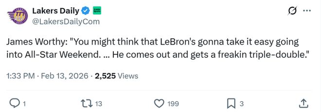 面对詹姆斯如此傲人的表现,湖人名宿沃西感叹道:“当你认为詹姆斯可能会在全明星周末到来之际放松一下时,结果他一上场就拿了个三双。”