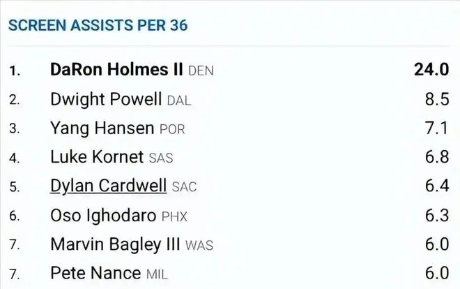 除了罚球优秀,小杨还有一项高阶数据排名联盟前三,真的让人没想到。根据NBA官网的统计,球员每36分钟的掩护助攻,小杨是7.1次,排名联盟第三!第一名是霍姆斯,第二名是鲍威尔。从小杨不多的出场时间里,我们也经常能看到,小杨的掩护质量很高,今天的比赛中,小杨就给亨德森做了一次精彩的“戈塔特掩护”,亨德森突破到篮下,小杨在油漆区挂住了贝利和辛森两个人,直接让亨德森上空篮了,这就是小杨在进攻端的隐形价值。
