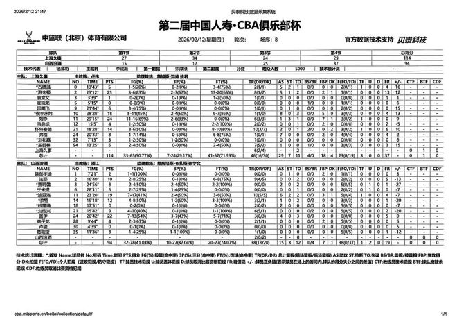 北京时间2026年2月12日19:30,第二届中国人寿·CBA俱乐部杯决赛打响,山西汾酒在内蒙古体育馆,挑战卫冕冠军上海久事。本场比赛,山西队进攻状态欠佳,防守不够积极主动,包括篮板球处于劣势,导致大比分落后,下半场全队有明显改善,并在末节奋力追分,但终究不敌对手,最终全场比赛结束,山西汾酒94:114不敌上海久事,获得第二届CBA俱乐部杯亚军。