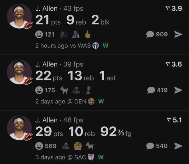 跟哈登这样的传球大师合作,最开心的莫过于骑士内线球员,比如阿伦最近三场比赛在前者喂饼下,分别贡献29分10板、22分13板和21分9板,直接打出全明星级别中锋的数据,尽管人家早在21-22赛季就入选过全明星。