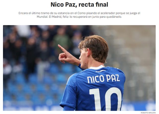 科莫一直希望永久买断尼科-帕斯,向皇马支付一笔费用,废除回购条款。不过,皇马的计划是回购阿根廷小将。《阿斯报》指出,皇马管理层、教练组已经决定,明年6-7月份将尼科-帕斯带回俱乐部,并且不再外租。对尼科-帕斯来说,在皇马一线队效力,这会是梦想成真。