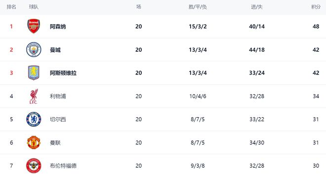 在积分榜上,阿森纳以48分排名榜首。阿森纳的优势扩大了,领先身后的曼城6分之多,争冠形势非常乐观。阿斯顿维拉的积分和曼城一样,也是42分,排名第3。第4的是利物浦,拿到34分。利物浦的排名要想提升非常困难,保住第4名或许是最靠谱的目标。切尔西和曼联都是31分,排名第5和第6。热刺只拿到27分,排名第13。