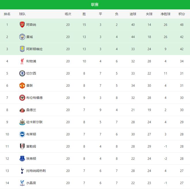 利物浦曼城被绝平,英超积分榜:阿森纳6分领跑,第5至第14差4分