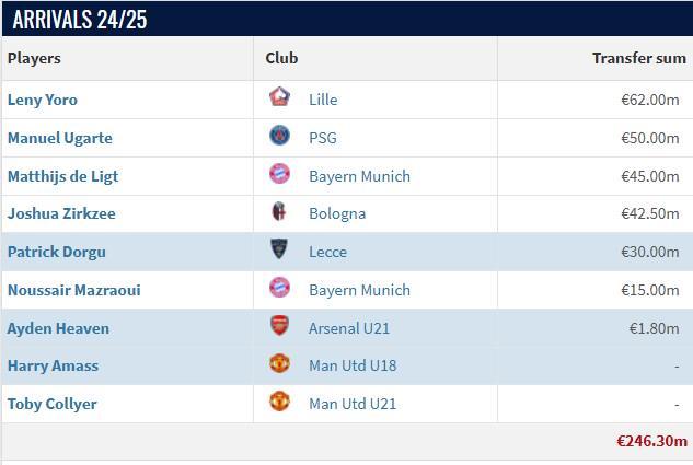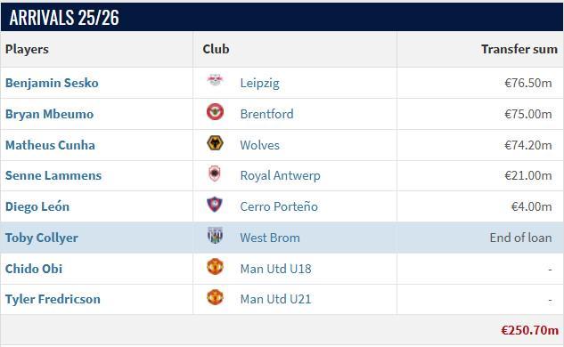 阿莫林时期曼联引援:花费2.825亿欧元签七人,谢什科7650万欧最高