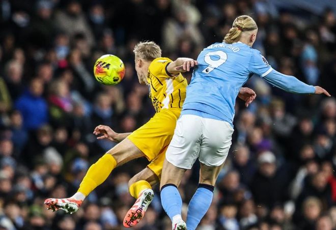 比赛刚开始不久,布莱顿就制造出机会。格罗斯近距离头球攻门,门将把球扑出。紧接着,卡迪奥卢获得绝佳机会,他突入禁区右侧,起脚射门,但踢得太正。门将把球拦下。第15分钟,伯纳多-席尔瓦的低射踢得太正。门将把球没收。第25分钟,哈兰德甩头攻门,顶偏了。第39分钟,多库制造点球机会。哈兰德主罚命中。半场结束,曼城1-0领先布莱顿。