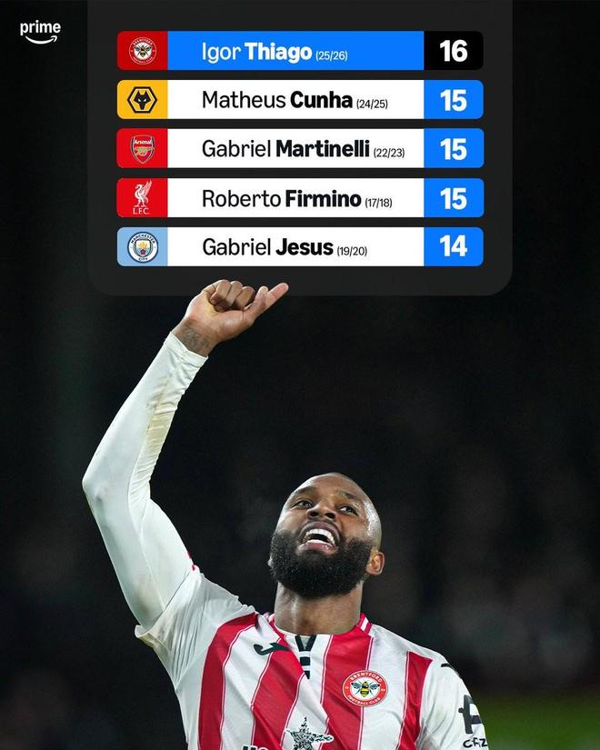据统计,这使得伊戈尔-蒂亚戈超越2024-25赛季的马特乌斯-库尼亚、2022-23赛季的马丁内利和2017-18赛季的菲尔米诺(均为15球),成为单赛季英超进球最多的巴西球员。