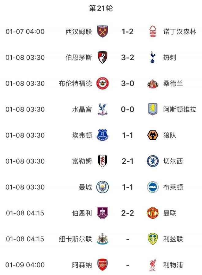 英超第 21 轮的多场对决堪称跌宕起伏,豪门球队的表现更是牵动着无数球迷的心弦,既有曼城的持续低迷,也有伯恩茅斯的绝境翻盘,赛场内外的故事交织成了本轮联赛的独特风景线。