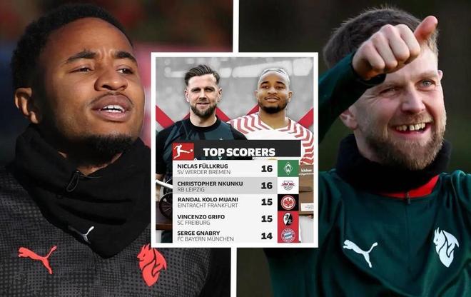 对于一名前锋来说,恩昆库的3粒进球并没有太强的说服力,而菲尔克鲁格更是拉胯,但回顾二人的德甲生涯,却都是大杀四方的进球机器。22/23赛季,效力于不莱梅(最终排名第13位)的菲尔克鲁格和RB莱比锡(最终排名第3)的恩昆库以16个进球并列德甲射手榜第一。