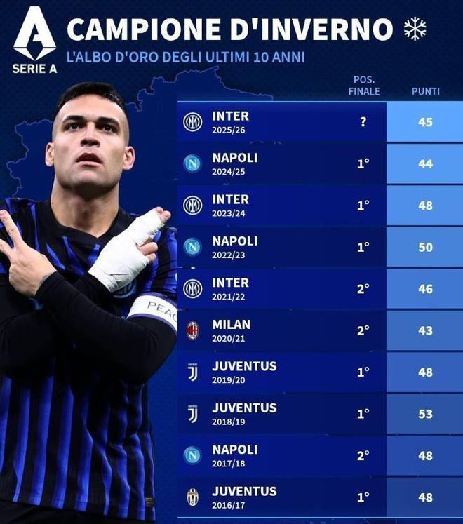此役胜利后,国米以46个积分成为本赛季意甲半程冠军。媒体更是列出一项值得玩味的数据,那就是过去10个赛季的意甲半程冠军中,其中有6队最终成功捧起意甲桂冠。