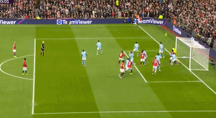 第4分钟,多古左路低平球传中,胡桑诺夫关键解围,随后B费开出角球,马奎尔近距离头球攻门击中横梁弹出,曼城逃过一劫。