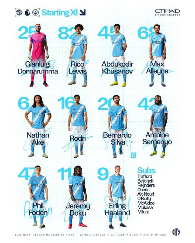 曼城首发:25-多纳鲁马、68-阿莱恩、45-胡桑诺夫、82-里科-刘易斯、6-阿克、47-福登、16-罗德里、20-伯纳多-席尔瓦、11-多库、42-塞门约、9-哈兰德