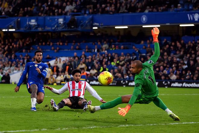 比赛开始后第10分钟,布伦特福德后防出现回传失误,加纳乔突入禁区,凯莱赫果断出击将球破坏;第22分钟,沙德摆脱查洛巴防守后将球扫到门前,桑切斯同样出击将球扑出。第26分钟,卡约德后场在恩佐和加纳乔的合力压迫下出球失误,若昂-佩德罗笑纳大礼门前停球抽射成功打破僵局,1:0!