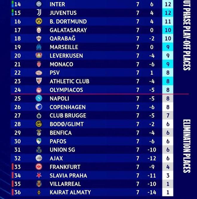 2025-26赛季欧冠联赛阶段今天凌晨结束了第7轮的争夺,北京时间1月29日凌晨,联赛阶段第8轮,也就是最后一轮比赛将统一开打,谁能直接晋级,谁将参加附加赛,谁又将结束本赛季欧冠之旅,我们一起来看一下7轮过后的积分形势。