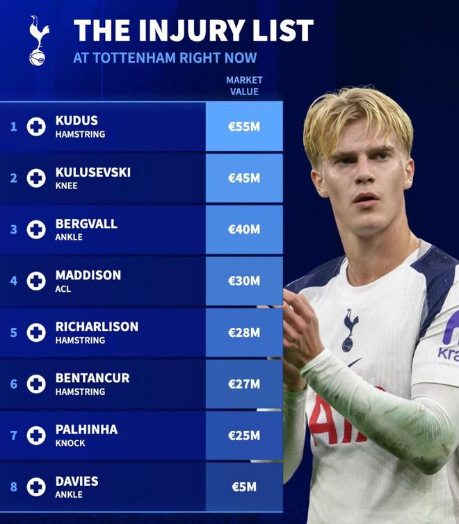北京时间1月23日,在卢卡斯-贝里瓦尔脚踝受伤可能缺阵长达3个月之后,德转列出了托特纳姆热刺目前的伤病名单,8名因伤高挂免战牌的球员总身价达到了2.55亿欧元。
