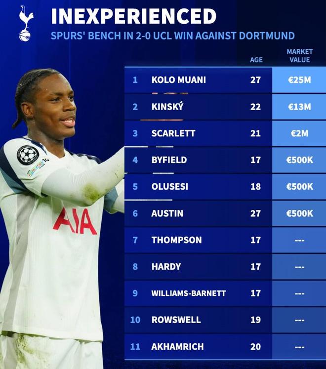 德转的统计同时指出,在欧冠联赛阶段第7轮热刺主场2-0击败多特蒙德的比赛中,热刺替补席上的11名球员中有5人甚至在德转上都没有身价,剩余6人总身价也仅为4150万欧元。