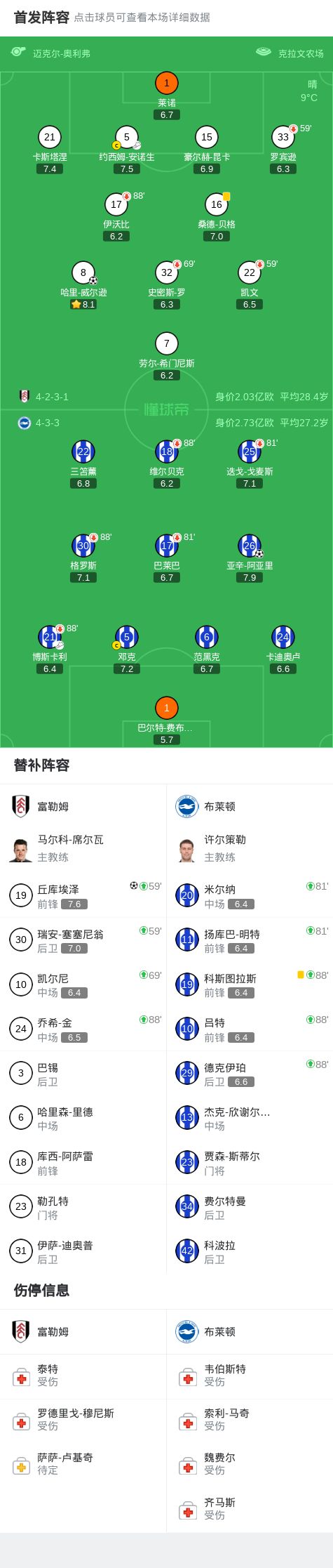 第90+2分钟,哈里-威尔逊任意球直接破门,富勒姆2-1布莱顿