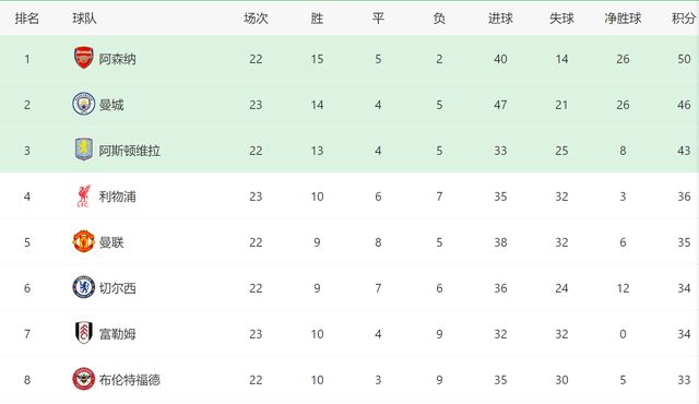 英超第23轮结束了5场比赛,最新积分榜如下!