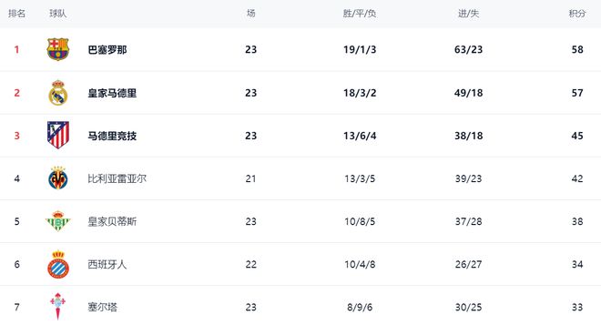 在积分榜上,巴萨依然占据榜首位置,战绩是19胜1平3负,拿到了58分。赢球的皇马紧随其后,拿到57分。前2的差距只有1分,冠军的争夺真是太激烈了。而落败的马竞依然是45分,排名第3。马竞与前2的球队差距实在是太大了,想要进一步往上爬希望渺茫。比利亚雷亚尔以42分排名第4。比利亚雷亚尔只踢了21轮,比马竞少2分。皇家贝蒂斯拿到38分,排名第5。第6的是西班牙人,拿到34分。