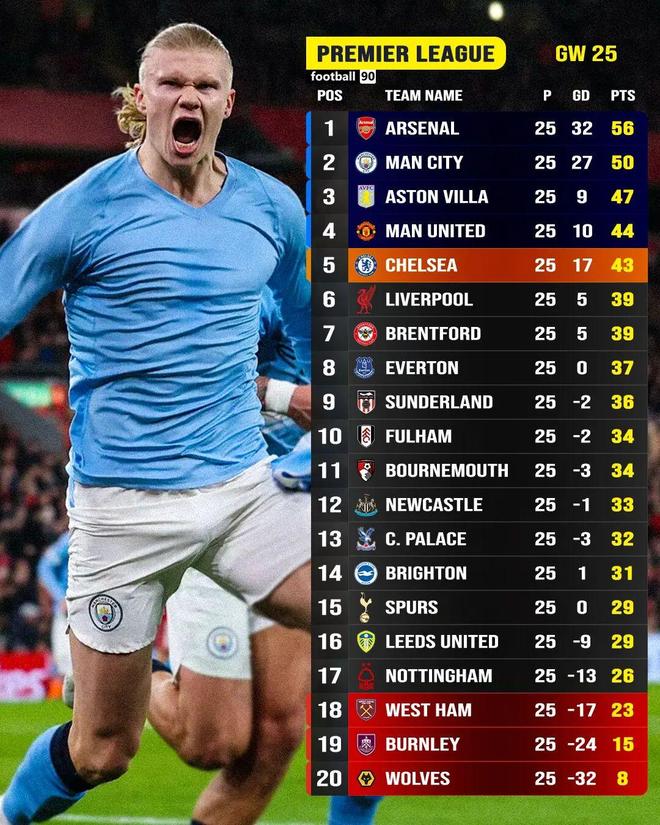 北京时间2月9日凌晨,随着本轮焦点战利物浦主场遭曼城绝杀,英超第25轮十场比赛全部战罢。阿森纳3比0完胜桑德兰,继续6分领跑英超;曼城凭借哈兰德93分钟的制胜点球2比1力克利物浦,坐稳次席,领先本轮打出平局的维拉3分;曼联2比0击败热刺,继续排名第四,距离维拉3分;切尔西3比1击败狼队,领先本轮输球的利物浦4分,两队分列第五、第六。