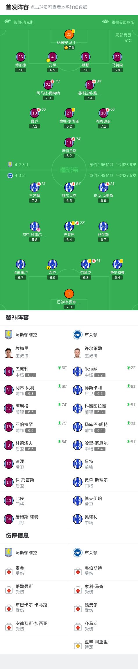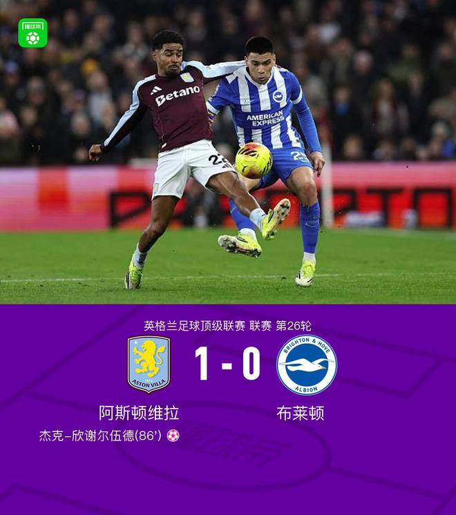 北京时间2月12日英格兰足球顶级联赛 联赛 第26轮,阿斯顿维拉主场对阵布莱顿。布莱顿杰克-欣谢尔伍德自摆乌龙。最终比分阿斯顿维拉 1-0 布莱顿。