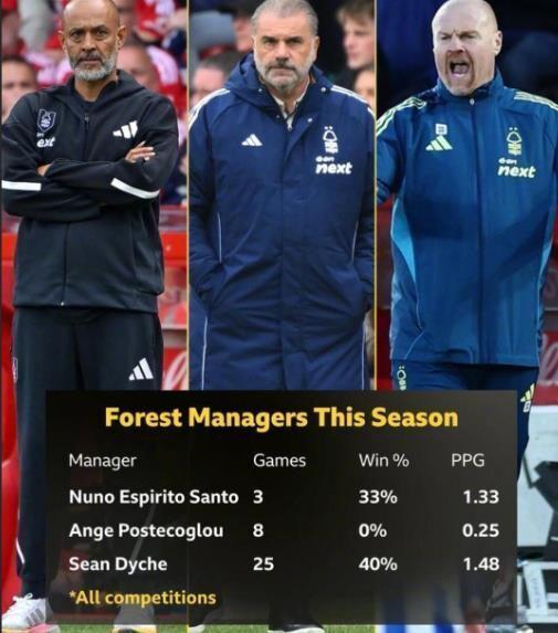 只要看看本赛季诺丁汉森林这三位前任主帅的战绩,努诺执教3场,胜率33%,场均积1.33分,离队原因与老板关系破裂;波斯特科格鲁执教8场,战绩更是无法直视的2平6负胜率0%,场均积0.25分;肖恩戴奇执教25场,胜率40%,场均积1.48分,戴奇其实是这三人中成绩最好的那个。 他40%的胜率甚至超过了曾经带队进欧战的努诺(38.36%)。如果只计算戴奇上任后的积分,森林甚至能排在积分榜中游。但他还是下课了。